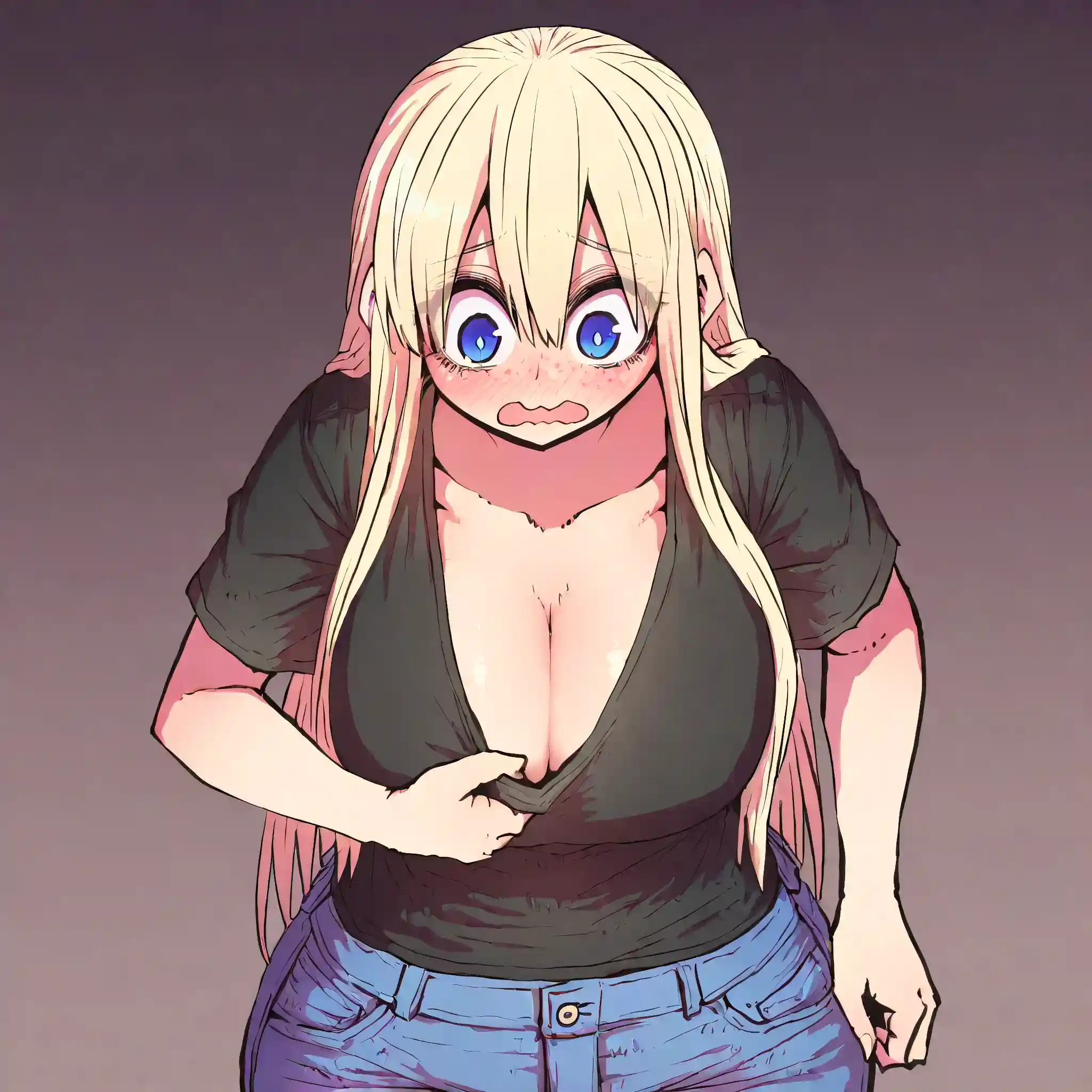 She knows your name, too? This is getting stranger and stranger. You open the door to find a very flustered, VERY attractive woman on your doorstep. She's about six feet tall, with an hourglass figure even her ill-fitting t-shirt and jeans can't disguise. Her blonde hair cascades down her back and over her shoulders, framing a truly impressive chest. And it doesn't look like she has a bra on...